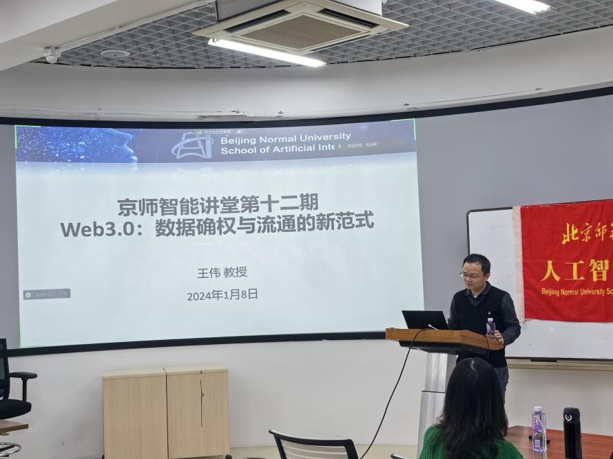 2024年1月8日,协议换爱 京师智能讲堂第十二期在海淀校园成功举行,同学们积极参与,本次讲座特邀北京交通大学教授、博士生导师王伟教授,以“Web3.0:数据确权与流通的新范式”为题进行学术报告。