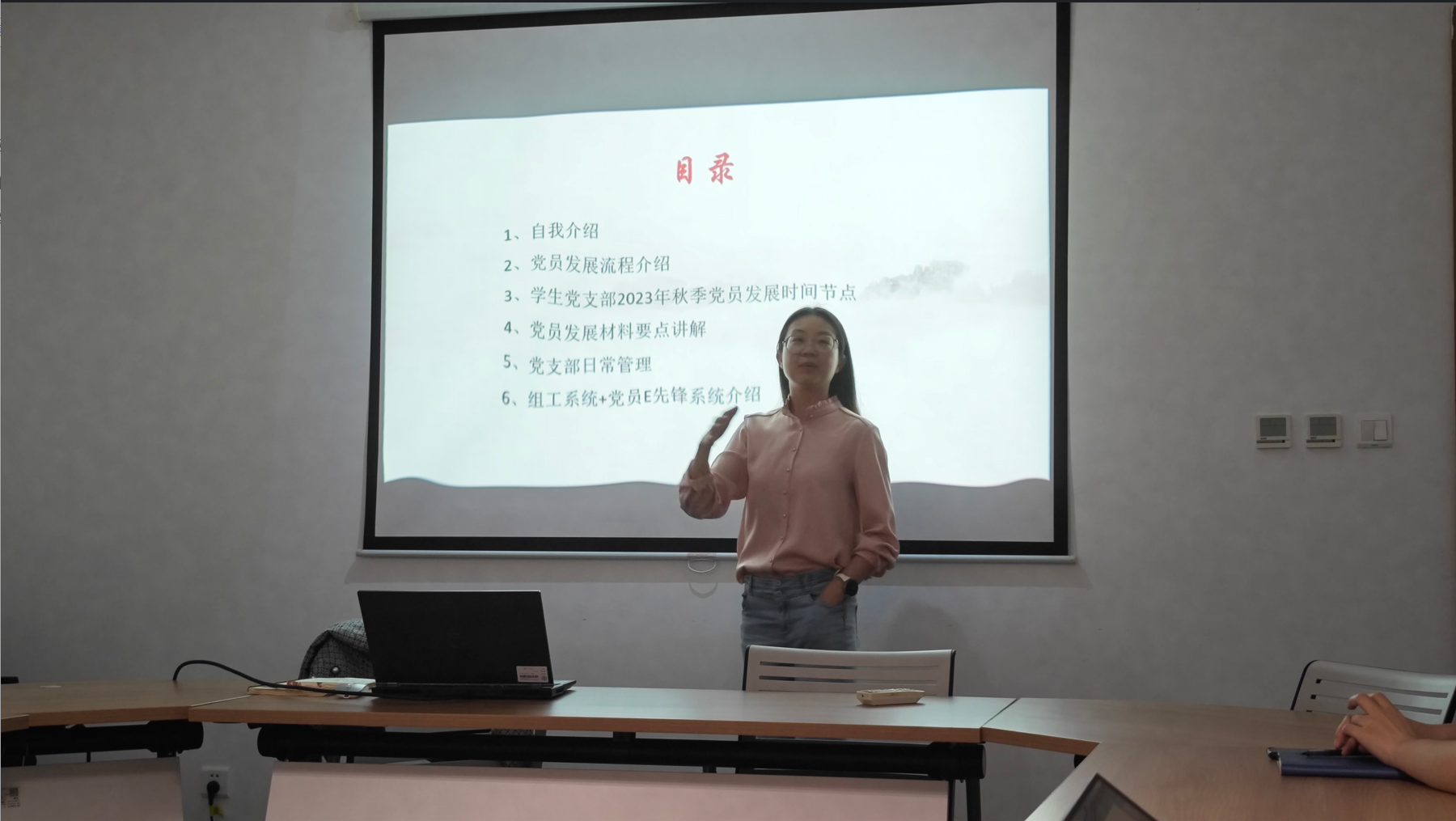 会上,石红薇老师首先祝贺新学期学生党支部支书支委的当选,并强调了学生支部工作的重要性。在大家都互相充分认识之后,石老师介绍党员的发展流程:从成为入党申请人开始,到成为积极分子、发展对象、预备党员,最后到转正的各个阶段都需要支部委员会对新同志进行认真的联系培养和详细的考核记录。石老师尤其强调了2023下半年各个阶段党员发展的时间节点,并提醒支书需要按时召开党员大会、完成三会一课,做好新生党员的接续培养。接着,石老师重点讲解了党支部的日常管理工作,详细明确了各位党支委的职责。