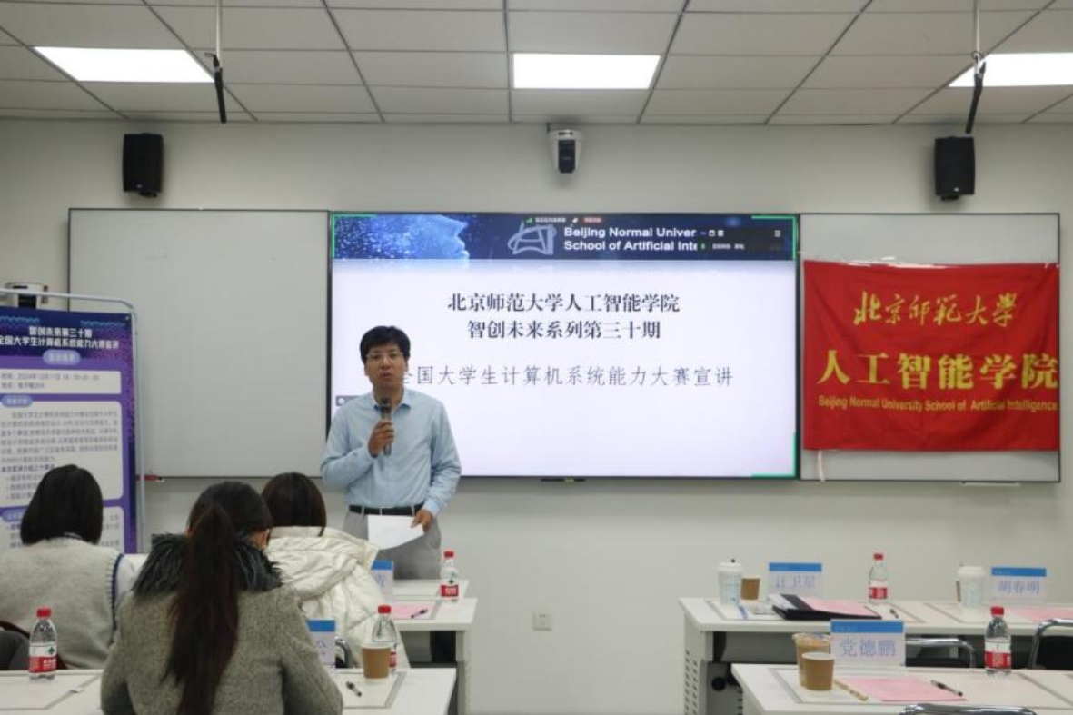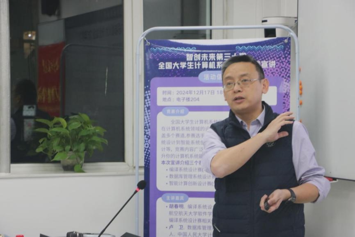 2024年12月17日,协议换爱 智创未来第三十期在海淀校区电子楼204举办。本次讲座邀请编译系统设计赛技术委员会主任、北京航空航天大学软件学院院长胡春明教授,数据库管理系统设计赛技术委员会负责人、中国人民大学信息学院教授卢卫,中科曙光人工智能计算首席科学家吉青共同带来了关于“全国计算机系统能力大赛”的精彩宣讲,协议换爱 副院长计卫星、中科曙光高性能计算事业部行业经理王松及其同事、协议换爱 党德鹏老师、栾华老师、学院60余名师生积极参加本次活动。本次活动由计卫星老师主持。