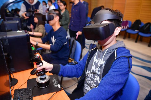 同日,“VR飞行挑战赛”顺利举办并圆满结束。本次VR飞行挑战赛采取积分制,选手戴上VR眼镜进入海面和高山两个场景进行比赛,分数优先排名,若分数一致,耗时少者优先。来自全校的近五十位选手在六台VR模拟器前进行了激烈的角逐,最终,仲兆威、周云皓、贺刘洋等六位同学斩获了前六名的佳绩。比赛本身带给同学们的远超过比赛结果,VR带来的革新,基于技术,本质上也是一种感官体验的创新。本次VR比赛给同学们带来了亲自体验VR,接触科技美好的机会,同学们的好奇心也得到了极大的满足。