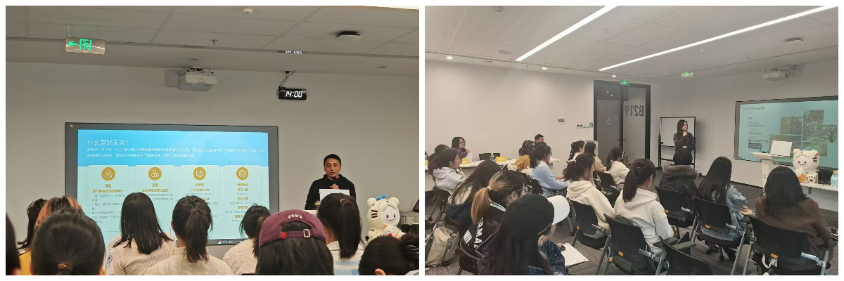 接着,好未来公司的员工为师生们围绕着公司业务、工作体验、校招流程等各方面展开讲解。首先,好未来的赵永立老师详细介绍了公司的业务范围和发展历程,让师生们对好未来有了更加全面的了解。介绍后,同学们围绕着新人入职之后的培养方式、入职之后的岗位流动等问题提问,赵老师细致解答。随后,在好未来任职的北师大校友秦晋学姐、阚雨菲学姐分别分享了产研类、编程类的工作经验。她们结合自己的亲身经历,讲述了在校期间如何选择岗位,如何准备笔面,到到入职之后在好未来公司成长的点点滴滴,从工作、学习和生活等方面全方位展示了好未来的协议换爱,也为即将步入职场的师弟师妹们提供了宝贵的建议。最后,好未来的人力资源部门的负责老师详细介绍了校招职位,包括岗位需求、工作内容、薪资待遇及职业发展路径等。介绍结束后,会议进入了交流咨询环节。享受着茶歇的同时,同学们抓住与hr面对面交流的机会,咨询自己感兴趣的问题,比如实习生招聘的条件、工作时间地点内容、薪资待遇等等,现场气氛热烈而融洽,大家都收获满满。