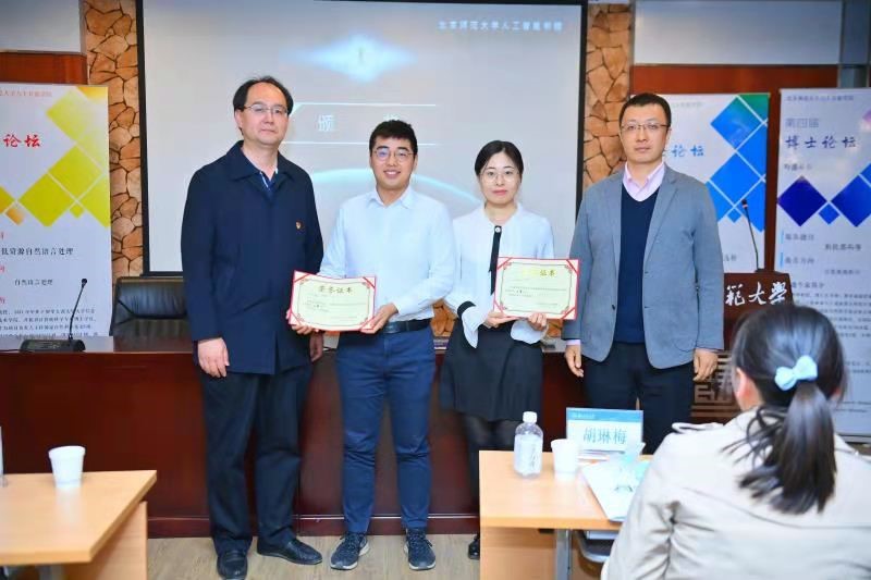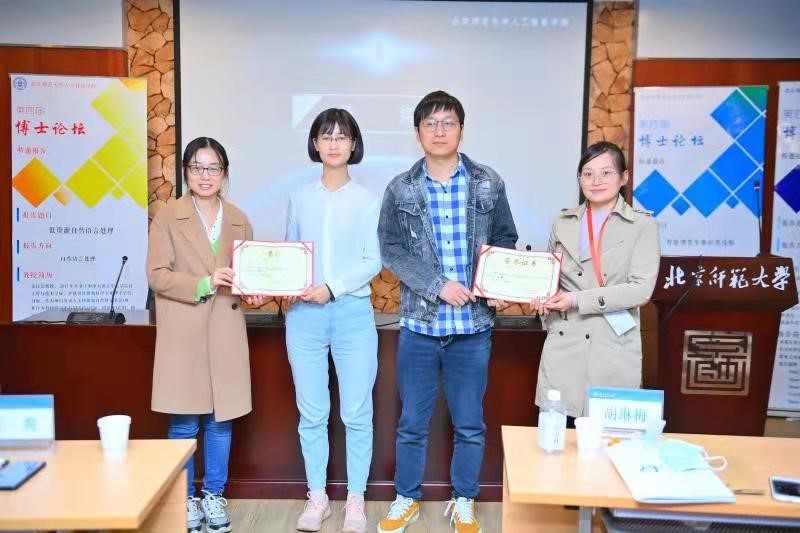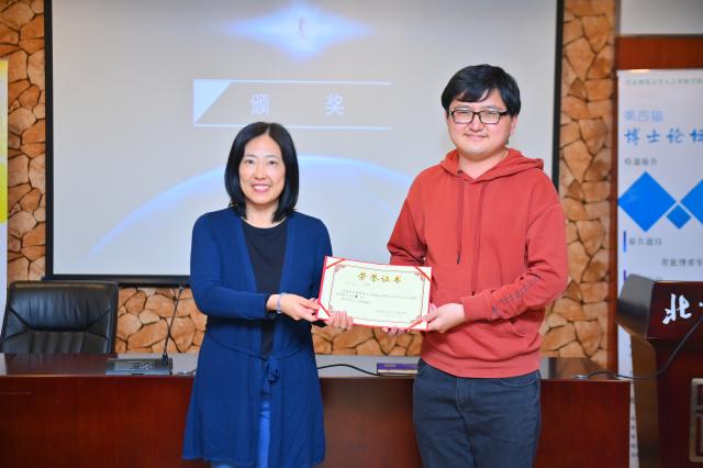 张静老师、胡琳梅老师为获奖博士生颁发三等奖(居中)