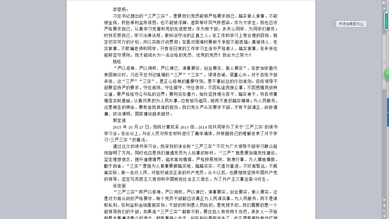 通过这次的读书学习讨论会,同学们均深刻地体会到“三严三实”的意义,它不仅为广大领导干部学习群众路线指明了方向,同时也是我们普通党员为人处事的标杆。学习讨论会这样的学习方式有效地促进了支部与同学们的交流,起到了对同学们在理论学习和思想上的引领和指导作用。