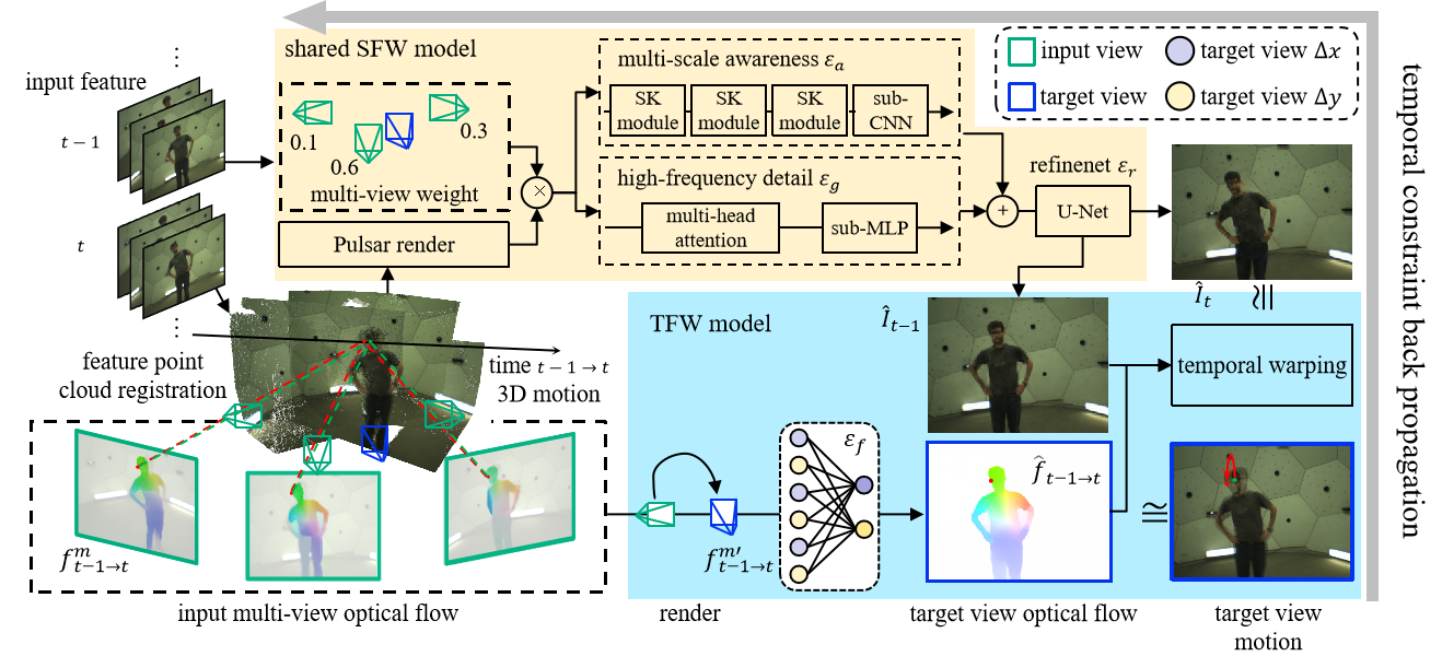 该论文提出了一种时空特征形变机制,构建了一个端到端稀疏动态视图合成模型。论文旨在稀疏的输入视图下实现高质量和时空一致的视图合成结果。时空特征形变机制包含了两个核心组件: (1)空间特征形变模块,通过学习一个紧凑的点云表示来感知多视图输入的上下文一致几何信息;(2)时间特征形变模块,引入光流先验,通过逼近目标图像坐标的像素偏移来建模三维动态几何。如图1所示,在公共多视图数据集的定性和定量评价表明,该论文提出的视图合成管道在视觉质量方面比以前的方法取得了更好的性能。