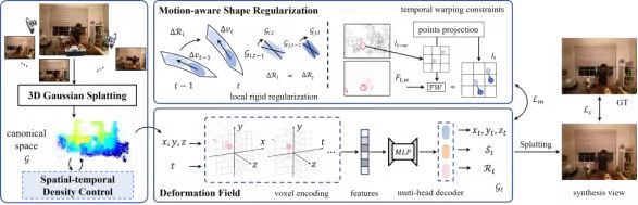 论文概述:针对实现高保真和高效率动态场景视图合成困难的问题,提出了一种新的时空4D高斯喷溅框架(ST-4DGS),旨在实现时空持久的动态渲染质量,并保持实时渲染效率。ST-4DGS的关键思想是提出了两种新的机制:(1)一种新的具有运动感知形状正则化的时空四维高斯溅射,有效地解耦四维高斯的运动部分和形状部分,以准确地估计四维高斯变形,(2)一种时空联合密度控制机制,联合时域和空域线索自适应地控制四维高斯的剪枝和分裂。该机制有效地防止了四维高斯表示在动态场景学习过程中的空间分布退化,有效地保持四维高斯分布的紧致性,从而在高保真质量下实现时空一致的动态呈现。在公共动态数据集进行了广泛的评估,ST-4DGS可以实现比最新的方法更好的持久性动态渲染质量,并具有更少的内存存储成本,同时实现了实时的渲染速度。