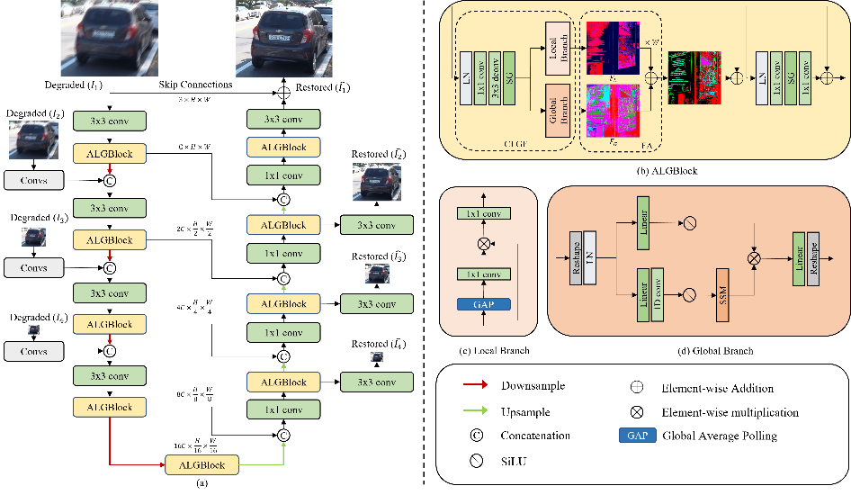 图像去模糊的目的是从相应的模糊图像恢复出高质量的图像。CNN和Transformer的出现带来了重大研究进展。然而,这些方法往往面临消除长程退化扰动和保持计算效率之间的两难。虽然选择状态空间模型(SSM)在建模具有线性复杂性的长程依赖关系方面表现出了希望,但它也面临着诸如局部像素遗忘和通道冗余等挑战。为解决该问题,本文提出一种高效的图像去模糊网络,利用选择状态空间模型来聚合丰富和准确的特征。具体而言,本文提出了一个聚合局部和全局信息块(ALGBlock),旨在有效地捕获和集成局部不变属性和非局部信息。该算法由两个主要模块组成:一个用于捕获局部和全局特征的模块(CLGF)和一个特征聚合模块(FA)。CLGF模块由两个分支组成:全局分支通过选择状态空间模型捕获长程依赖特征,而局部分支利用简化的通道注意力建模局部连通性,从而减少局部像素遗忘和通道冗余。此外,设计了一个FA模块,通过在两个分支聚合时重新校准权重来强调局部部分以进行修复。实验结果表明,所提出的方法在广泛使用的基准测试集上优于当前最先进的方法。