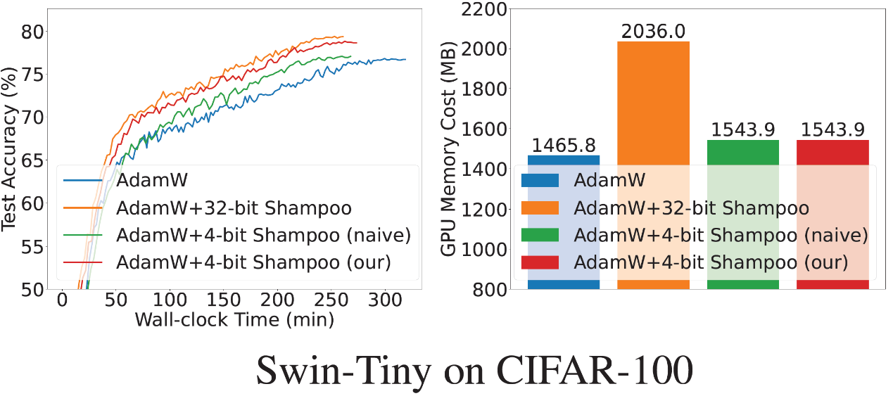 图中所示是图像分类任务上的一个实验结果。在相同训练时间时,本文提出的4比特二阶优化器AdamW+4-bit Shampoo (our) 与32比特的AdamW+32-bit Shampoo性能相当,显著优于AdamW, 以及直接4比特量化预条件矩阵的方法AdamW+4-bit Shampoo (naive). 在GPU峰值显存占用方面,本文提出的4比特二阶优化器AdamW+4-bit Shampoo (our) 显著低于32比特的AdamW+32-bit Shampoo,略微高于AdamW. 更详细的内容及代码请阅读我们的论文。