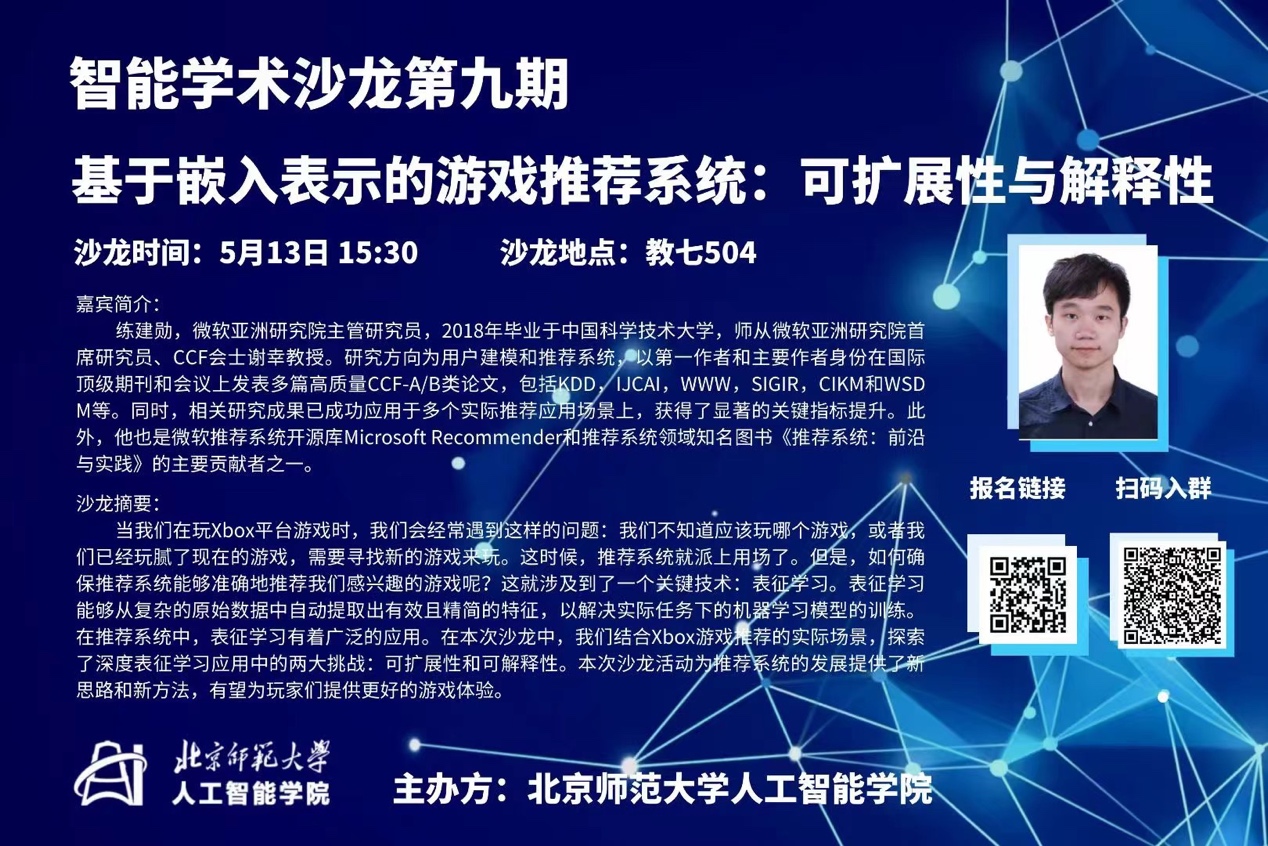 个人简介: 练建勋博士,微软亚洲研究院主管研究员,2018年毕业于中国科学技术大学,师从微软亚洲研究院首席研究员、CCF会士谢幸教授。研究方向为用户建模和推荐系统,以第一作者和主要作者身份在国际顶级期刊和会议上发表多篇高质量CCF-A/B类论文,包括KDD,IJCAI,WWW,SIGIR,CIKM和WSDM等。研究成果谷歌学术引用量高达2000余次。同时,相关研究成果已成功应用于必应广告、Xbox游戏和微软新闻等多个实际推荐应用场景上,获得了显著的关键指标提升。此外,他也是微软推荐系统开源库Microsoft Recommender和推荐系统领域知名图书《推荐系统:前沿与实践》的主要贡献者之一。